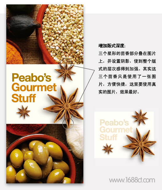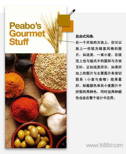 设计应该保持简单。这张图片占据了两个相邻的方块,标题文字在方块中的左方,这种构成与方块本身的形状一致。上图示意图中圆形的元素同样可以与方块形成良好的搭配,使到整个版面形成漂亮的圆形及长方形的组合构成。